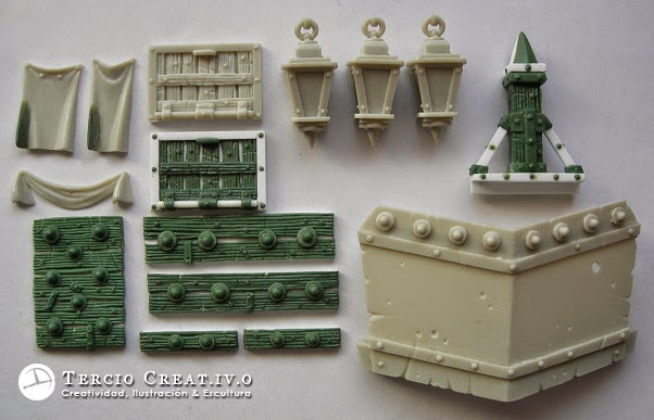 Here you are in this first image all the final pieces for Armored Wagon: Wagon, "engine", base, trap door, light turret, medium turret, heavy turret and impact marker. These will be used to assemble/use any type of Armored Wagon in 1650. And on the second image you can see some of the Vehicle Panoply (options) to customize them, although we will make more.